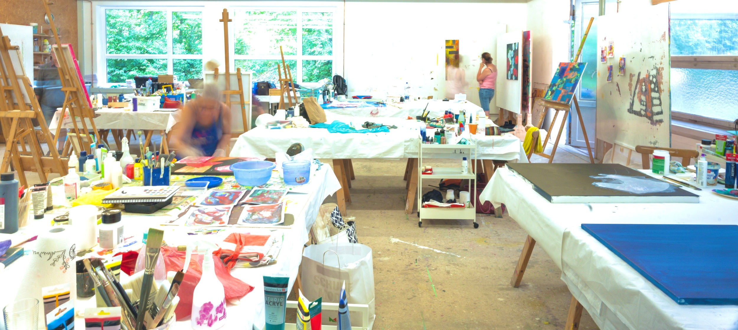 Für große Formate und erste Mixed Media Versuche war in unseren großen Ateliers viel Platz und die TeilnehmerInnen fuhren mit tollen Ergebnisse zurück in die 'Zivilisation"
